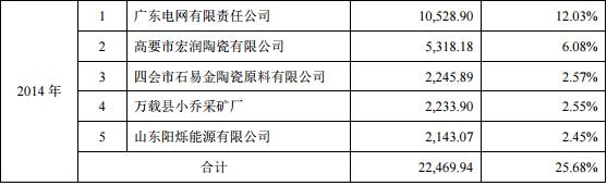 在新版的招股書中,2015年,公司前5大供應(yīng)商分別是廣東電網(wǎng)有限責(zé)任公司、高要市宏潤陶瓷有限公司、佛山市圣八達(dá)貿(mào)易有限公司、萬載縣小喬采礦廠、萬載灝翔達(dá)采礦廠,采購金額分別為10220.23萬元、5427.98 萬元、2402.34 萬元、 2276.07 萬元、2253.53萬元,占采購總額的比例分別為12.04%、 6.40%、2.83%、2.68%、2.66%。