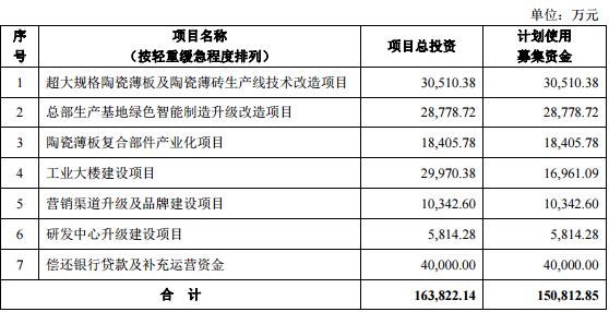 1.超大規(guī)格陶瓷薄板及陶瓷薄磚生產(chǎn)線技術(shù)改造項(xiàng)目,項(xiàng)目總投資30,510.38萬元,計(jì)劃使用募集資金30,510.38萬元;2.總部生產(chǎn)基地綠色智能制造升級改造項(xiàng)目,項(xiàng)目總投資28,778.72萬元,計(jì)劃使用募集資金28,778.72萬元;3.陶瓷薄板復(fù)合部件產(chǎn)業(yè)化項(xiàng)目,項(xiàng)目總投資18,405.78萬元,計(jì)劃使用募集資金18,405.78萬元;4.工業(yè)大樓建設(shè)項(xiàng)目,項(xiàng)目總投資29,970.38萬元,計(jì)劃使用募集資金16,961.09萬元;5.營銷渠道升級及品牌建設(shè)項(xiàng)目,項(xiàng)目總投資10,342.60萬元,計(jì)劃使用募集資金10,342.60萬元;6.研發(fā)中心升級建設(shè)項(xiàng)目,項(xiàng)目總投資5,814.28萬元,計(jì)劃使用募集資金5,814.28萬元;7.償還銀行貸款及補(bǔ)充運(yùn)營資金,項(xiàng)目總投資40,000.00萬元,計(jì)劃使用募集資金40,000.00萬元。
