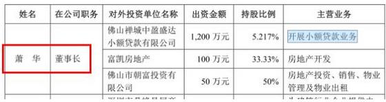 野馬財經(jīng)發(fā)現(xiàn),蕭華是一家名為“佛山禪城中盈盛達(dá)小額貸款有限公司”(下稱:中盈盛達(dá))的股東。該公司注冊資本2.3億,成立于2011年,主要業(yè)務(wù)是辦理小額貸款、開展中小微企業(yè)融資、理財咨詢。