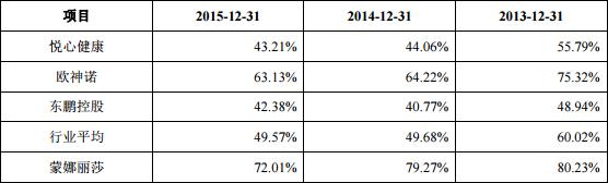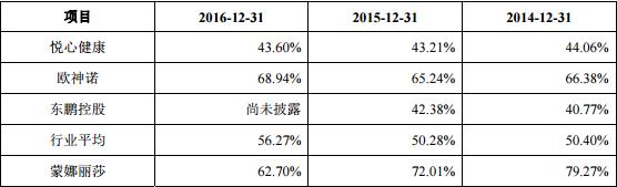 另外,由于去年6月,在香港上市三年的東鵬控股正式從香港退市。因此,東鵬控股2016年資產(chǎn)負(fù)債率暫無法對比。另一競爭對手悅心健康2014年至2016年的資產(chǎn)負(fù)債率分別為44.06%、43.21%、43.60%,這份數(shù)據(jù)更是遠(yuǎn)低于蒙娜麗莎。
