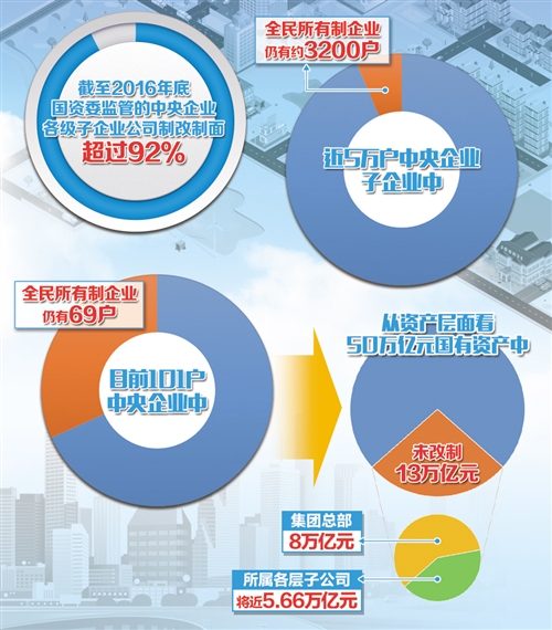 近年來,國資委積極推進國有企業(yè)公司制改革。截至2016年底,國資委監(jiān)管的中央企業(yè)各級子企業(yè)公司制改制面超過92%。但由于改制成本高、耗時長等原因,一定程度上影響了改制工作進度。目前101戶中央企業(yè)中,仍有69戶集團公司為全民所有制企業(yè);近5萬戶中央企業(yè)各級子企業(yè)中,仍有約3200戶為全民所有制企業(yè)。