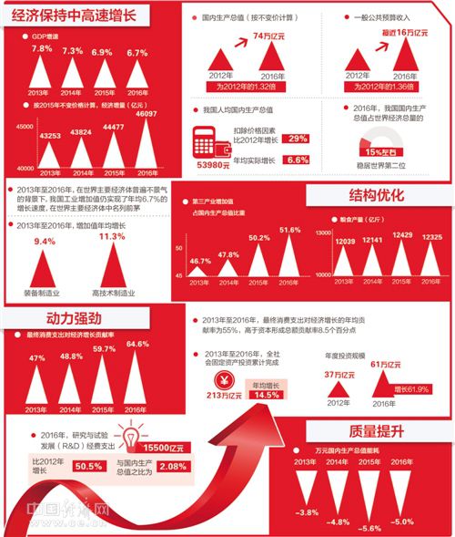 GDP年均增速7.2%,高于同期世界2.5%和發(fā)展中經(jīng)濟(jì)體4%的平均增長(zhǎng)水平;CPI年均上漲2.0%,低于年度漲幅預(yù)期調(diào)控目標(biāo);城鎮(zhèn)新增就業(yè)連續(xù)四年保持在1300萬(wàn)人以上,31個(gè)大城市城鎮(zhèn)調(diào)查失業(yè)率基本穩(wěn)定在5%左右……這些有溫度的數(shù)據(jù),記錄著我國(guó)在2013年至2016年間取得的輝煌成績(jī)。