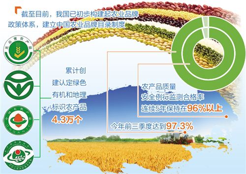 “中國農(nóng)業(yè)品牌正駛?cè)肟焖俳】蛋l(fā)展的快車道,成為現(xiàn)代農(nóng)業(yè)發(fā)展的亮麗風(fēng)景?!鞭r(nóng)業(yè)農(nóng)村部部長韓長賦表示,近年來我國大力實施品牌強農(nóng)戰(zhàn)略,取得了積極成效。截至目前,已初步構(gòu)建起農(nóng)業(yè)品牌政策體系,建立中國農(nóng)業(yè)品牌目錄制度。累計創(chuàng)建認(rèn)定綠色有機和地理標(biāo)識農(nóng)產(chǎn)品4.3萬個,形成了一批特色地域名片。品牌化帶動了農(nóng)業(yè)生產(chǎn)標(biāo)準(zhǔn)化,農(nóng)產(chǎn)品質(zhì)量安全例行監(jiān)測合格率連續(xù)5年保持在96%以上,今年前三季度達(dá)到97.3%,更多優(yōu)質(zhì)農(nóng)產(chǎn)品受到消費者青睞。
