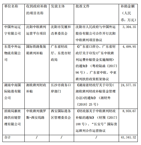 其中,中國外運在2019年7月-9月期間獲得的超過500萬元人民幣的大額政府補貼項目有:沈陽中歐班列運營平臺項目獲得補助金額3304.35萬元、國際鐵路集裝箱班列補貼獲得補助金額4499.95萬元、湘歐班列財政補貼獲得補助金額2.46億元、中歐班列俄羅斯-西安線路獲得補助金額8959.67萬元。
