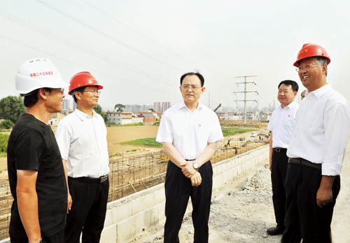 在忻州西站以北的大西客專與忻五公路交叉地段,京太鐵路(雄忻段)引入大西客專施工現(xiàn)場,李俊明詳細(xì)了解大西客專既有線路、雄忻高鐵接軌的近期工程和預(yù)留遠(yuǎn)期規(guī)劃,實地察看左右進出線的路基打樁、擋墻施工、路基幫寬等正在進行的工程,聽取各主要節(jié)點工期計劃安排,詢問工程實施中的困難問題。