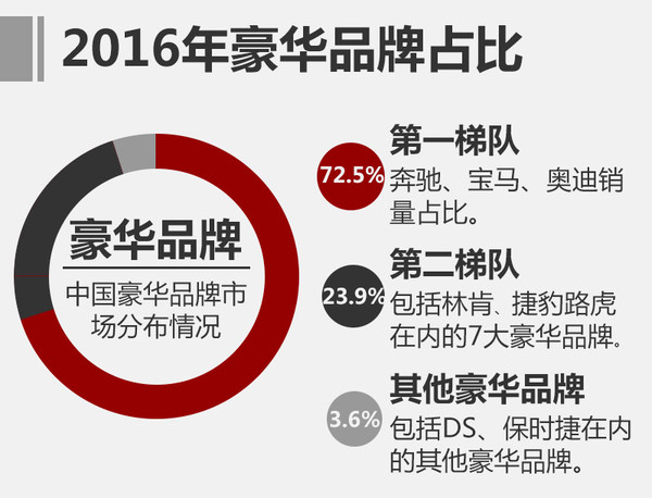 而包括捷豹路虎、凱迪拉克、雷克薩斯、沃爾沃、英菲尼迪、林肯和謳歌組成的豪華品牌第二梯隊(duì),2016年總銷(xiāo)量為520,354輛,占整個(gè)豪華車(chē)市場(chǎng)23.9%。注:保時(shí)捷品牌定位問(wèn)題,不算在第二梯隊(duì)內(nèi)。