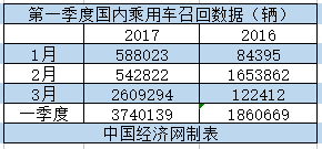 2016年,國內(nèi)乘用車召回數(shù)量首次突破一千萬輛,達(dá)到11331565輛。進(jìn)入2017年,國內(nèi)乘用車召回數(shù)量繼續(xù)井噴,今年一季度累計召回汽車3740139輛,同比2016年一季度的1860669輛增長了101.01%。