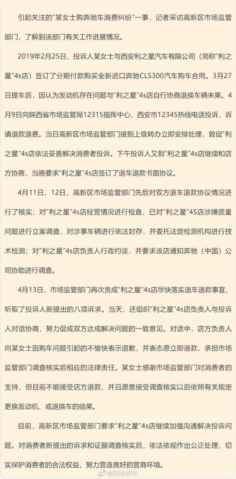 據(jù)西安市互聯(lián)網(wǎng)信息辦公室官方微博消息稱(chēng),4月13日,高新區(qū)市場(chǎng)監(jiān)管部門(mén)曾組織利之星4S店負(fù)責(zé)人與投訴人進(jìn)行對(duì)話(huà)協(xié)商。對(duì)話(huà)中,店方負(fù)責(zé)人向奔馳女車(chē)主因購(gòu)車(chē)問(wèn)題引起的不愉快表示道歉,并表態(tài)愿立即退款、承擔(dān)市場(chǎng)監(jiān)管部門(mén)調(diào)查核實(shí)后相應(yīng)的法律責(zé)任。該奔馳女車(chē)主感謝市場(chǎng)監(jiān)管部門(mén)對(duì)消費(fèi)者的支持,但目前不能接受店方退款,也愿意接受調(diào)查核實(shí)以后依照有關(guān)規(guī)定更換發(fā)動(dòng)機(jī)、或退換車(chē)的結(jié)果。