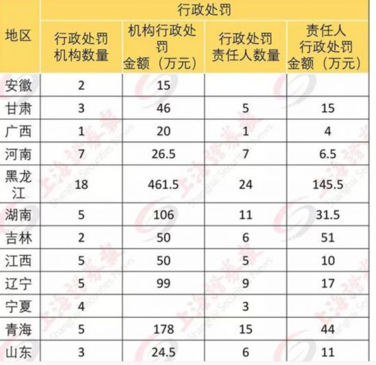 處罰機(jī)構(gòu)5個以上的地區(qū)有:黑龍江(處罰機(jī)構(gòu)18個,對機(jī)構(gòu)罰款合計(jì)461.5萬元;處罰責(zé)任人24個,對責(zé)任人罰款合計(jì)145.5萬元);重慶(處罰機(jī)構(gòu)10個,對機(jī)構(gòu)罰款合計(jì)348萬元;處罰責(zé)任人15個,對責(zé)任人罰款合計(jì)131萬元)。
