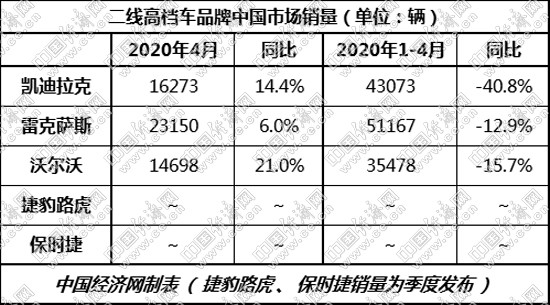 得益于抗疫形勢持續(xù)向好,復(fù)工復(fù)產(chǎn)加快推進(jìn),4月二線高檔車市場呈現(xiàn)加速回升之勢。其中,按照月度公布銷量的三大品牌,4月均實(shí)現(xiàn)同比正增長,凱迪拉克、沃爾沃增幅更是達(dá)到兩位數(shù),而雷克薩斯也有著6%的上升,為二季度發(fā)展奠定良好開局。