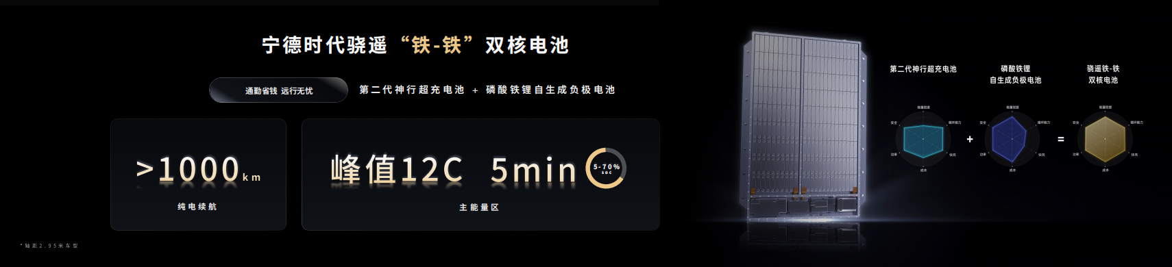 鐵-鐵雙核電池:第二代神行超充電池+磷酸鐵鋰自生成負(fù)極電池,在軸距接近3米的車型上可輕松實(shí)現(xiàn)千公里純電續(xù)航,同時(shí)讓每公里通勤成本低至1毛錢(qián)。