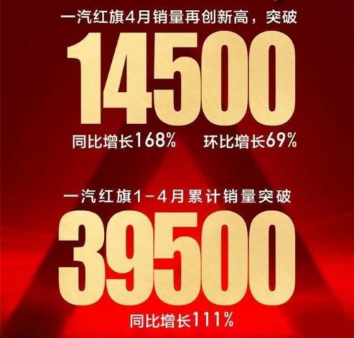 2019年,紅旗品牌累計銷量突破100000輛大關(guān),同比增長200%以上,銷量目標(biāo)比計劃提前了整整一年。然而,今年年初,一場突如其來的疫情,給全球汽車產(chǎn)業(yè)帶來了巨大的沖擊,大部分車企品牌銷量陷入一片下滑之中,而一汽紅旗卻逆勢而上,實現(xiàn)了超高增長。數(shù)據(jù)顯示,紅旗品牌4月份銷量14500輛,同比增長168%,環(huán)比增長69%;1—4月累積銷量突破39500輛,同比增長111%。