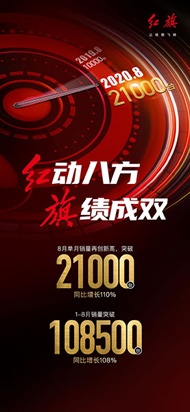 近日,紅旗對(duì)外發(fā)布8月銷售數(shù)據(jù)顯示:單月總銷量突破2.1萬輛,同比增110%,其中HS5單品月銷過萬。1-8月,紅旗累計(jì)銷量突破108500輛,同比增長108%,繼續(xù)書寫“新紅旗速度”。