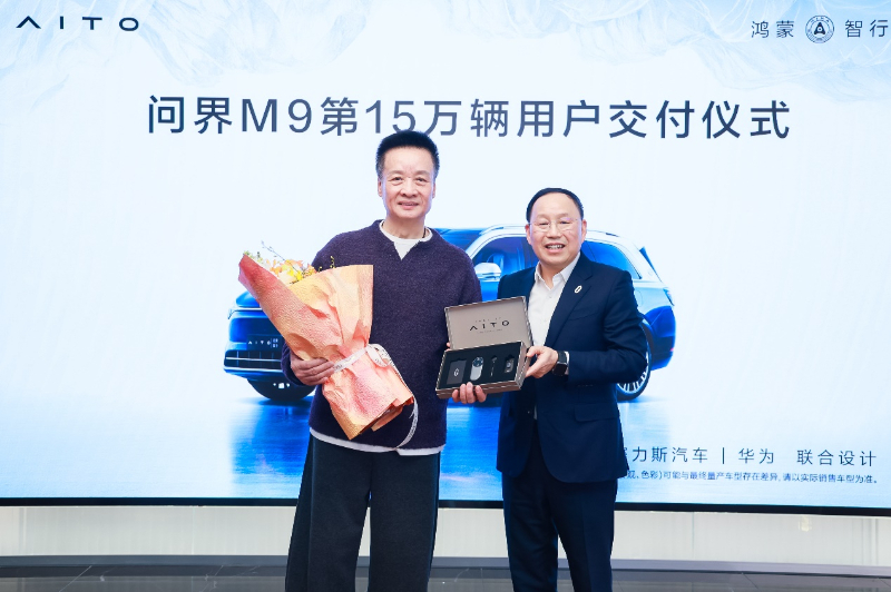 2025年1月8日,問界M9第15萬輛用戶交付儀式在北京舉行。賽力斯集團(tuán)董事長(創(chuàng)始人)張興海向著名男高音歌唱家、藝術(shù)家閻維文老師交付問界M9第15萬輛新車鑰匙,共同見證了“世界級好車”問界M9開啟嶄新篇章的歷史性時刻。