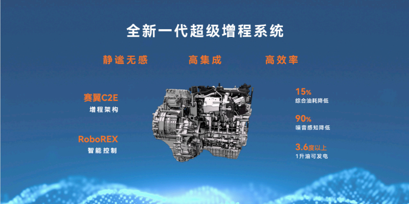 作為一種全新的高集成化解決方案,賽翼增程架構(gòu)通過高度集成化的設(shè)計(jì),使得增程系統(tǒng)的體積更小、重量更輕,從而減少了運(yùn)行過程中的振動和噪音。同時,配合RoboREX智能增程控制技術(shù),實(shí)現(xiàn)了智能主動能量管理,使增程器由被動工作變?yōu)橹鲃庸ぷ?,不僅提高了能源利用效率,還進(jìn)一步降低了噪音感知。據(jù)悉,全新一代賽力斯超級增程系統(tǒng)綜合油耗降低15%,噪音感知降低了90%,增程器實(shí)際效率超過3.6kWh/L,達(dá)到了行業(yè)量產(chǎn)增程器的領(lǐng)先水平。