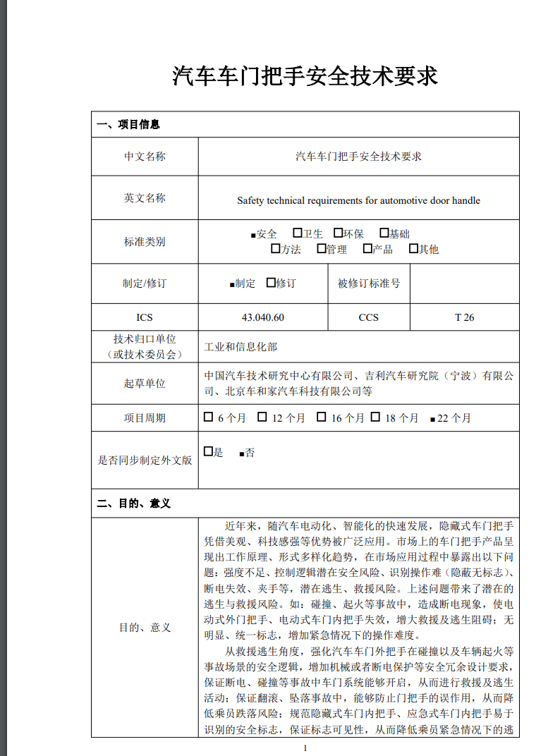 文件中還提到,目前國外暫無隱藏式門把手在布置、標(biāo)志、安全功能、結(jié)構(gòu)強度等方面的技術(shù)要求。
