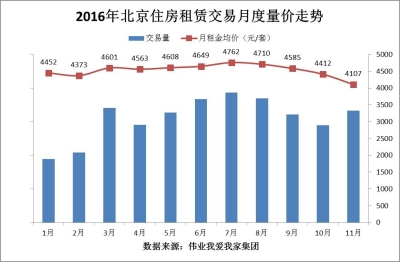 按照慣例,10月之后北京租賃市場(chǎng)進(jìn)入傳統(tǒng)淡季,剛剛過(guò)去的11月,北京月租金均價(jià)創(chuàng)年內(nèi)新低。據(jù)偉業(yè)我愛(ài)我家集團(tuán)市場(chǎng)研究院統(tǒng)計(jì),2016年11月,北京區(qū)域通過(guò)我愛(ài)我家達(dá)成的住宅租賃交易量環(huán)比10月同期上漲14.8%,但月租金均價(jià)為4107元/平米,環(huán)比10月下跌6.9%。