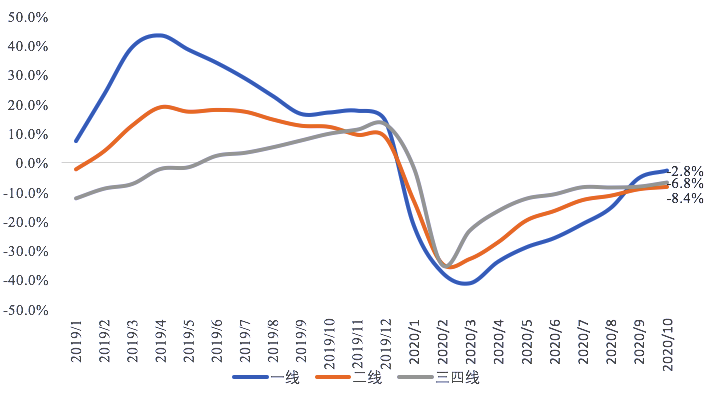 貝殼研究院統(tǒng)計(jì)整理數(shù)據(jù)顯示,截止2020年10月一線城市新房市場(chǎng)成交量恢復(fù)逐漸放緩,其中成交套數(shù)累計(jì)同比下滑2.8%、成交面積累計(jì)同比下滑1.8%;二線城市成交套數(shù)累計(jì)同比下滑8.4%、成交面積累計(jì)同比下滑9.5%;三四線城市成交套數(shù)累計(jì)同比下滑6.8%、成交面積累計(jì)同比下滑4.4%。整體環(huán)比9月基本持平。一線城市新房市場(chǎng)10月持續(xù)領(lǐng)跑全國(guó),二線以下城市累計(jì)成交量同比下滑幅度持續(xù)穩(wěn)定,調(diào)控升級(jí)后,市場(chǎng)動(dòng)力一般。