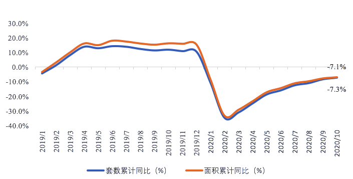 貝殼研究院統(tǒng)計(jì)整理數(shù)據(jù)顯示,2020年10月66城新房市場(chǎng)合計(jì)成交套數(shù)單月同比增長(zhǎng)2.6%,環(huán)比下滑13.7%,成交面積單月同比下滑0.5%,環(huán)比下滑12.9%。由于自7月以來(lái),深圳、南京、杭州、成都等多城市出臺(tái)調(diào)控升級(jí)政策,預(yù)防出現(xiàn)過(guò)熱現(xiàn)象,10月成交量環(huán)比明顯下滑。1-10月66城新房市場(chǎng)累計(jì)成交套數(shù)同比下滑7.1%,成交面積累計(jì)同比下滑7.1%,較9月累計(jì)降幅收窄不到1.0個(gè)百分點(diǎn),市場(chǎng)恢復(fù)速度持續(xù)放緩。