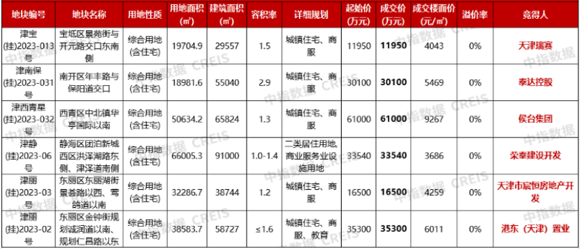 此外,津靜(掛)2023-06號(hào)地塊位于靜海區(qū)團(tuán)泊新城西區(qū)洪澤湖路東側(cè)、津澤道南側(cè),由天津市榮泰建設(shè)開發(fā)有限公司底價(jià)3.354億摘得,樓面價(jià)3686元/㎡。津南保(掛)2023-031號(hào)地塊位于南開區(qū)年豐路與保陽道交口,為南開天拖城市更新地塊,由泰達(dá)控股起始價(jià)3.01億元摘得,樓面價(jià)5469元/㎡。津?qū)?掛)2023-013號(hào)地塊位于寶坻區(qū)幸福路與景苑街交口西南角,由天津瑞賽起始價(jià)1.195億元摘得,樓面價(jià)4043元/㎡。