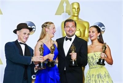 左起:第88屆奧斯卡最佳男配馬克·里朗斯、最佳女主布麗·拉森、最佳男主萊昂納多·迪卡普里奧和最佳女配艾麗西亞·維坎德