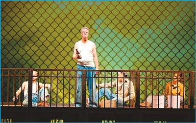 坐滿觀眾的劇場(chǎng),大幕拉開,燈光追隨,被判謀殺罪的銀行家安迪由獄警押解上場(chǎng)。身后的鐵牢籠里傳出起哄聲:“看吶,來(lái)新人了!”……