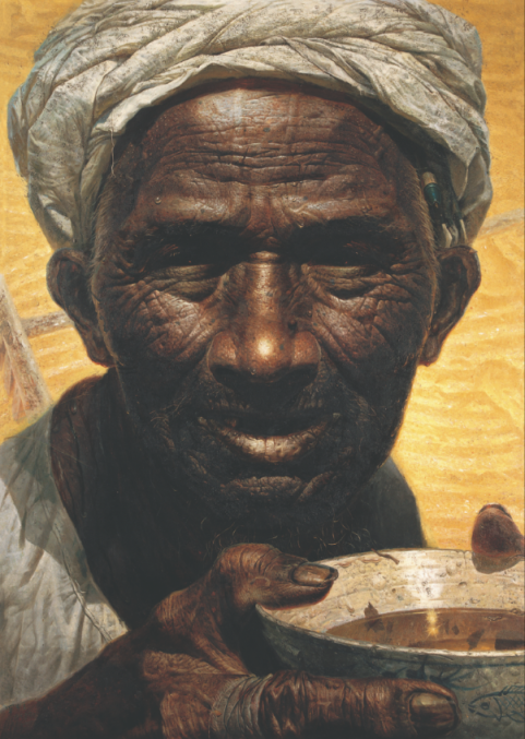 烈日下的一位老農(nóng),在勞動的間隙手捧粗瓷碗準(zhǔn)備喝水,大顆晶瑩的汗水流過他臉上深深的溝壑。展覽展出的羅中立油畫《父親》以紀(jì)念碑式的宏偉構(gòu)圖、超寫實(shí)的手法,飽含深情地刻畫出中國農(nóng)民的典型形象。1980年,羅中立以《父親》震撼中國畫壇,并獲第二屆全國青年美展一等獎。數(shù)十年來,這張臉龐深深打動了無數(shù)中國人的心,成為改革開放以來中國現(xiàn)實(shí)主義藝術(shù)創(chuàng)作的一道豐碑。