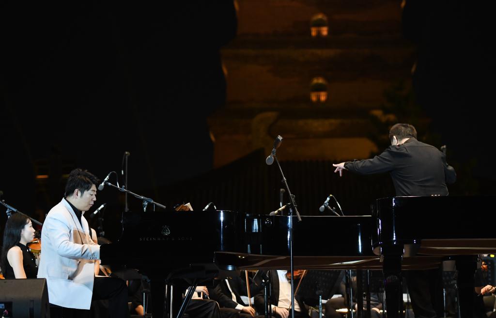 9月10日晚,鋼琴家郎朗(左)、指揮家呂嘉(右)與西安交響樂團在西安大雁塔北廣場戶外公演。新華社記者 李一博 攝