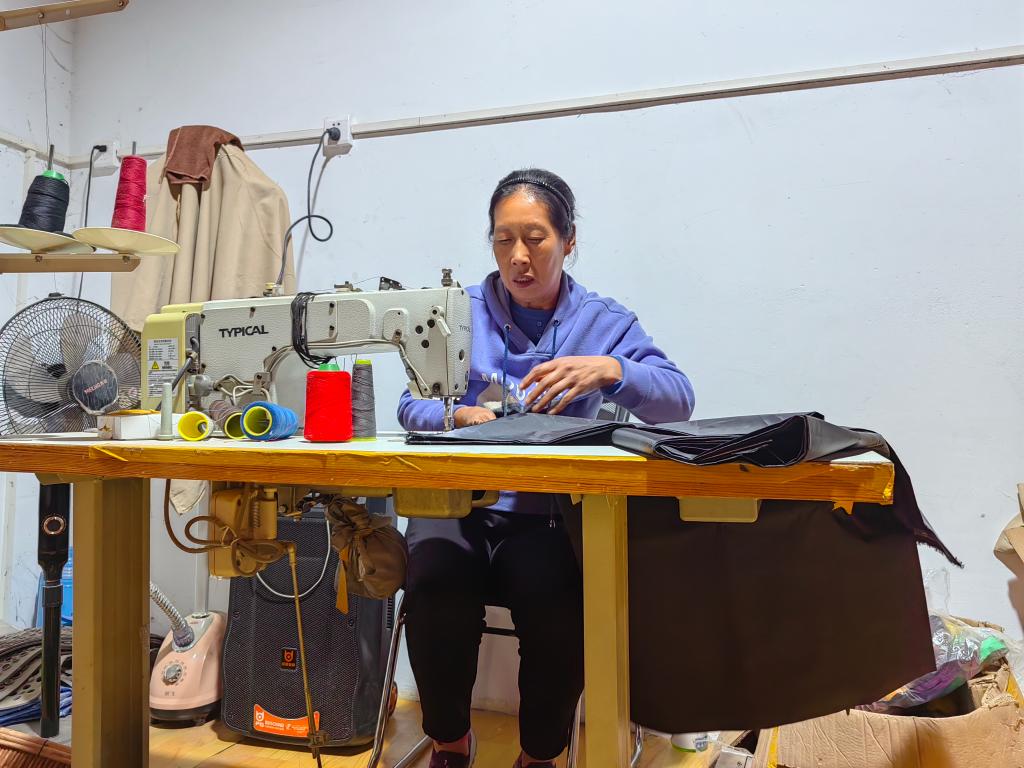 王能香在縫紉機前縫補演員的演出服裝。(新華社記者 馬曉潔 攝)