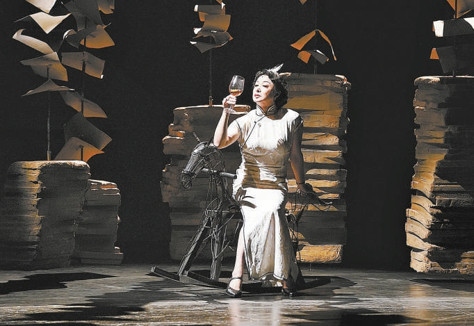 一身華服的陳白露,穿過(guò)這鬼魂般的群像,從斜坡上拾階而下,帶著與周遭一切格格不入的方達(dá)生走進(jìn)她的生活。一邊是燈紅酒綠、紙醉金迷的聲色場(chǎng)所,一邊是從天而降、堆疊成摞的書卷與賬單,象征著陳白露生活中并存的浪漫夢(mèng)想和殘酷現(xiàn)實(shí)。還有一個(gè)小搖馬,折射出陳白露并未完全失去天真,但總是搖擺不定的內(nèi)心。陳白露出場(chǎng)的每身服裝,不僅很美,也傳達(dá)著金星對(duì)人物的態(tài)度。從白色的緊身旗袍,到銀色的曳地長(zhǎng)裙,再到赭紅的飄逸長(zhǎng)袍,服裝顏色越來(lái)越深,款式卻越來(lái)越寬松,讓人能夠更形象地感受到陳白露越來(lái)越黯淡的生活和渴望擺脫束縛的靈魂。