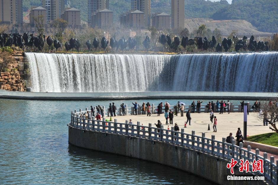 1月5日,游客在昆明瀑布公園內(nèi)游覽拍照。據(jù)了解,昆明瀑布公園1月1日開始對(duì)民眾開放,公園的瀑布利用牛欄江引水入滇工程而形成人工瀑布及湖泊,其利用約12.5米的地勢(shì)高差,建設(shè)成寬幅約400米的人工瀑布,是中國(guó)最大人工瀑布。 中新社記者 任東 攝
