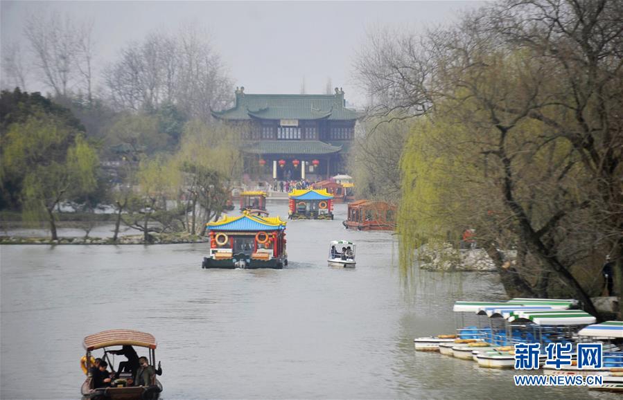 3月6日,游客在揚(yáng)州瘦西湖賞花。隨著氣溫升高,江蘇揚(yáng)州市瘦西湖景區(qū)楊柳吐綠,繁花似錦,吸引許多中外游客前來踏春賞花。 新華社發(fā)(孟德龍 攝)
