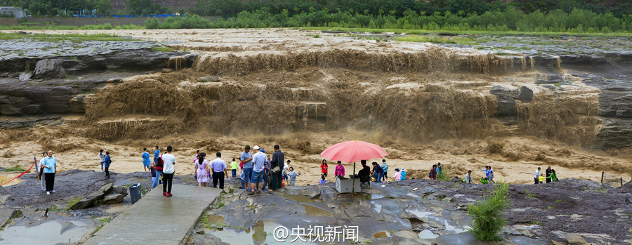 受上游強(qiáng)降雨和水庫放水影響,最近幾天,黃河壺口瀑布迎來伏汛,最大水流量達(dá)到每秒2600立方米左右,濁流滾滾奔騰而下,氣勢磅礴?。ㄑ胍曈浾呃钪?文豪)