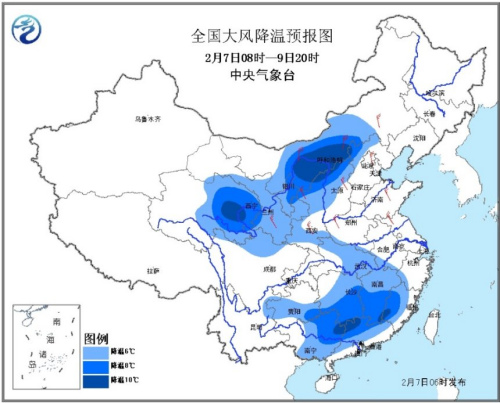 據(jù)中央氣象臺(tái)網(wǎng)站消息,2月7日06時(shí)繼續(xù)發(fā)布寒潮藍(lán)色預(yù)警:預(yù)計(jì),受寒潮影響,7日至9日,我國(guó)中東部大部地區(qū)自北向南將先后出現(xiàn)大范圍大風(fēng)降溫和雨雪天氣,平均氣溫將普遍下降4℃以上,其中,青海東部、陜西北部、內(nèi)蒙古中部、山西北部、貴州東南部、湖南中南部、江西中南部、福建西部、廣西北部和廣東北部等地氣溫將下降8℃以上,局地超過10℃。長(zhǎng)江以北地區(qū)并伴有4~6級(jí)偏北風(fēng),東部和南部海區(qū)風(fēng)力有7~9級(jí)。