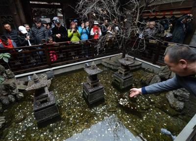 寬窄巷子記憶四川館今年1月中旬正式運營。館內(nèi)古色古香,擺放著各式各樣具有四川特色的茶具、盆景。然而,7日上午10點,記者在館中發(fā)現(xiàn),一處10平米不到的普通水池周圍圍滿了游客。這些游客有的駐足觀看,有的忘情自拍,更有不少游客掏出口袋中的硬幣,將1元、5角、1角硬幣拋向水池,或是瞄準水池中矗立著的3座燭塔,躊躇滿志打算將硬幣拋在塔頂。