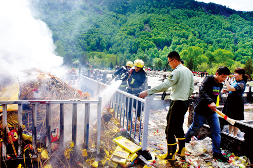 19日上午,中心區(qū)旅游人數(shù)達(dá)到峰值,五爺廟前的廣場是安保壓力最大的區(qū)域,按照活動《方案》建立了兩道隔離帶,公安民警、武警、消防、保安緊密協(xié)作,分兵把守,有序放行。在五爺廟前的焚香區(qū),武警戰(zhàn)士組成人墻迎接一浪高過一浪的人潮沖擊,確保了萬千游客的絕對安全,豆大的汗珠順著他們的臉頰不斷流淌。