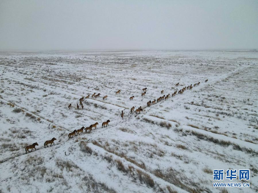 在新疆吉木薩爾縣境內(nèi)拍攝的普氏野馬(1月23日攝,無人機照片)。一場風(fēng)雪降臨,這里呈現(xiàn)出馬踏飛雪的冬日壯麗景象。