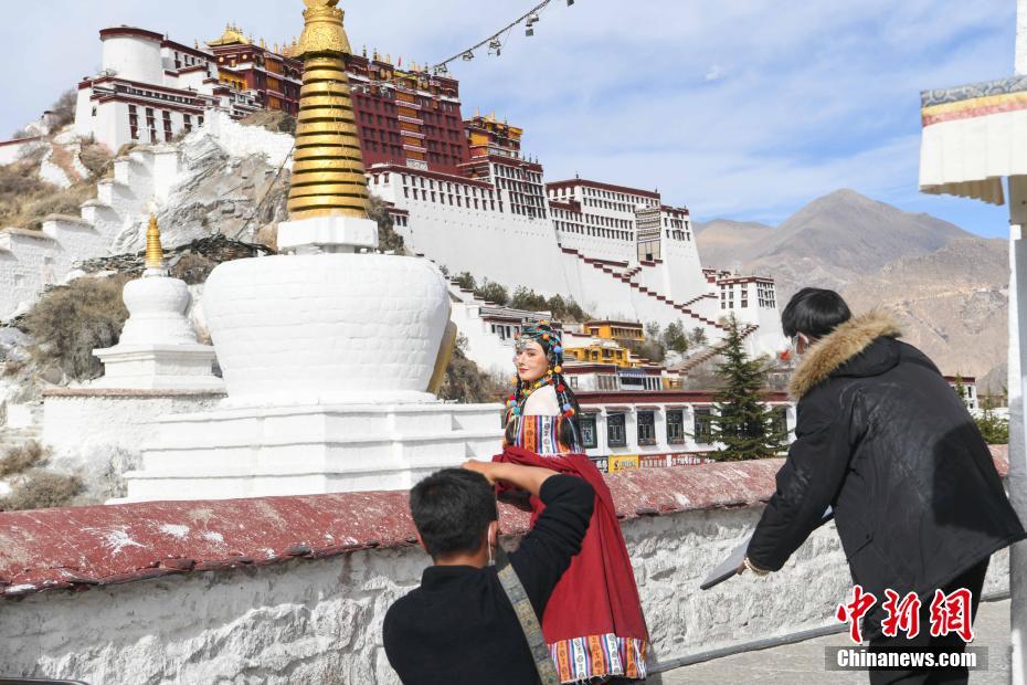 3月15日,游客在拉薩藥王山觀景臺身著藏族傳統(tǒng)服飾拍照留念。 中新社記者 貢嘎來松 攝