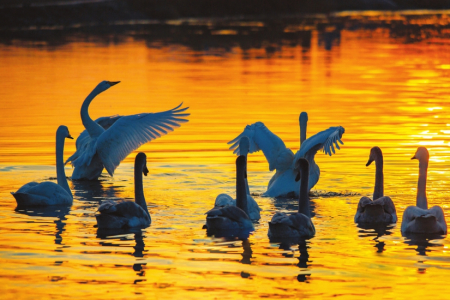 夕陽下運城市千年鹽湖內(nèi)的天鵝。