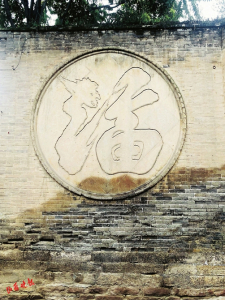 “龍鶴?!贝u雕影壁位于張壁古堡賈家巷,是官紳張禮維故居的一部分,建于清朝乾隆年間,至今已有二百多年歷史。影壁上的這個“福”字,起筆狂草灑脫俊逸,轉承行書剛勁有力,而落筆于“田”字時則急轉為楷端莊方正。福字集三種書法為一體,凌而不亂渾然天成。