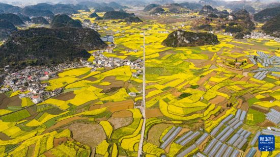 近日,貴州省六盤水市六枝特區(qū)木崗鎮(zhèn)的15000余畝油菜花競相綻放。金黃的油菜花同田地、道路、民居構成一幅幅美麗的春日畫卷。