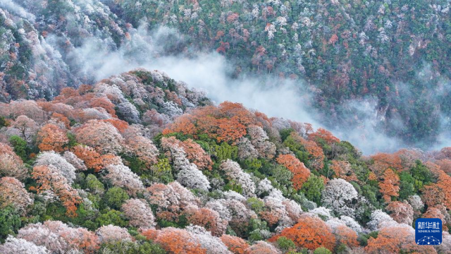 11月18日在貴州梵凈山景區(qū)拍攝的霧凇紅葉景觀(無人機照片)。新華社發(fā)(李鶴攝)