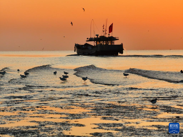 11月19日,海鳥在江蘇省連云港市贛榆區(qū)沿海濕地里覓食(無人機照片)。新華社發(fā)(司偉攝)