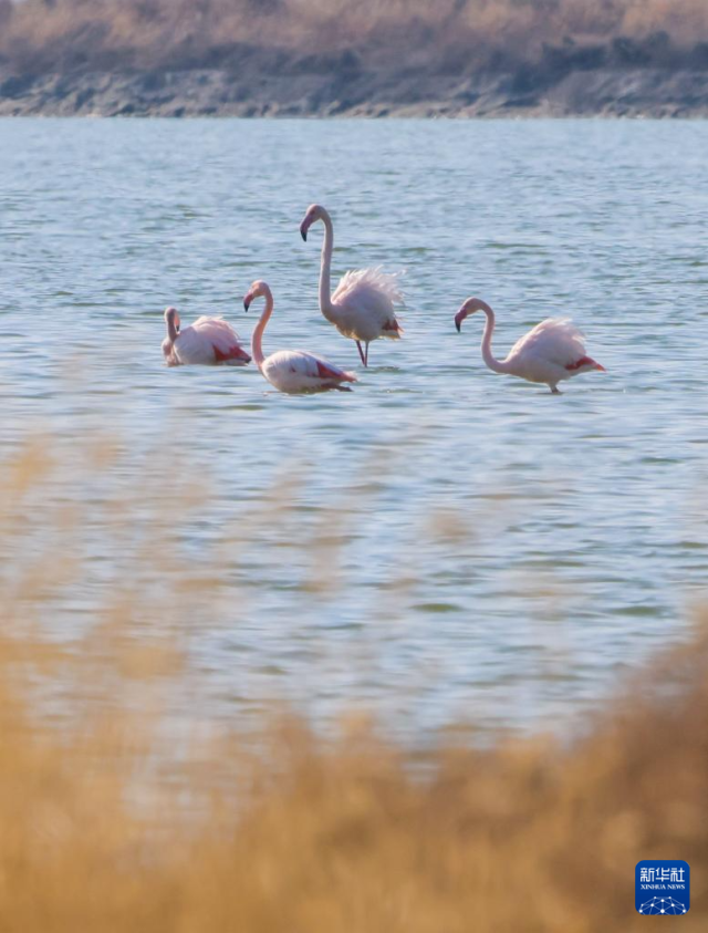 11月19日,火烈鳥在山西運城鹽湖棲息。新華社發(fā)(閆鑫攝)