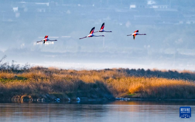 11月19日,火烈鳥在山西省運城鹽湖濕地飛翔。新華社發(fā)(薛俊攝)