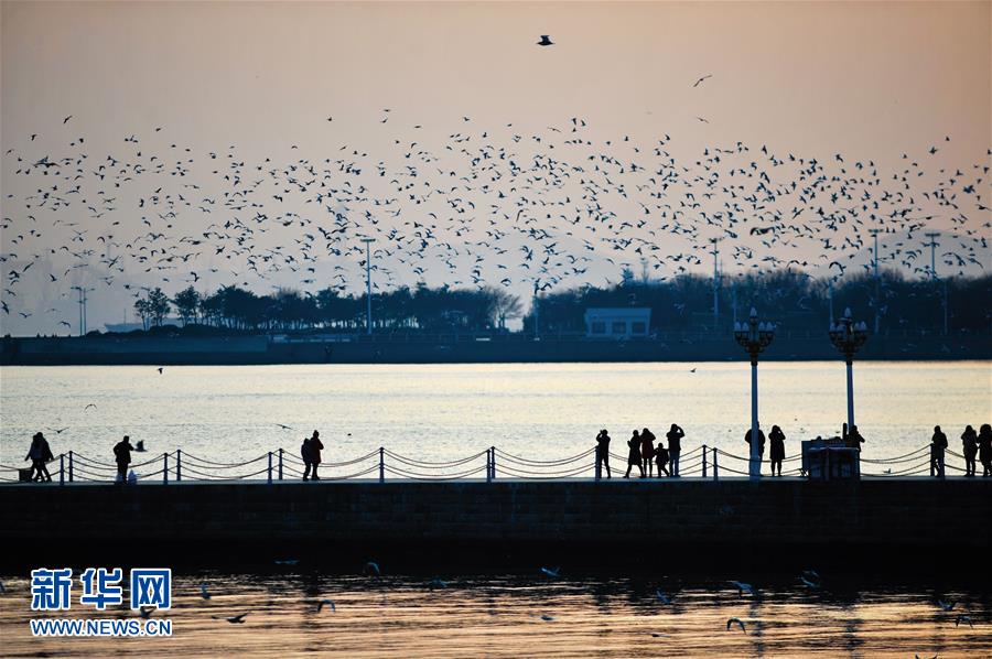 1月10日,水鳥在青島棧橋景區(qū)一帶飛翔。當(dāng)日,山東省青島市天氣晴好,黃昏時分沿海一帶景色迷人。 新華社發(fā)(王海濱 攝)