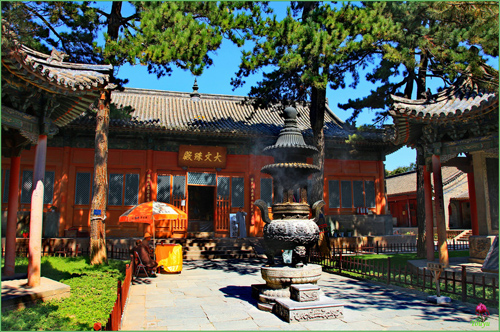 顯通寺的大雄寶殿為舉行佛事活動(dòng)主要場(chǎng)所,是顯通寺的第三重大殿,殿內(nèi)供著三尊佛像:中是釋迦牟尼佛,西是阿彌陀佛,東是藥師佛;兩旁有十八羅漢像背后有觀音、文殊、普賢三尊菩薩像。觀音殿殿內(nèi),中間供著觀音菩薩像,左右供著文殊和普賢菩薩像。大文殊殿,是顯通寺的第二重大殿。大文殊殿內(nèi),供著七尊文殊菩薩像:正中的為大智文殊;前面的五位,從左至右,依次為西臺(tái)獅子文殊,南臺(tái)智慧文殊,中臺(tái)孺者文殊,北臺(tái)無(wú)垢文殊,東臺(tái)聰明文殊;大智文殊后面是甘露文殊。文殊像前有護(hù)法神韋馱像,兩側(cè)有十八羅漢像。