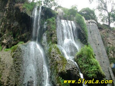 娘子關(guān)瀑布,是澤發(fā)水的源頭,人稱水簾洞,山坡谷中泉眼累累,形成懸泉。瀑布由多股泉水匯流而成,沿懸崖峭壁傾瀉而下,懸空如白練掛在石壁前,形成高達十幾丈高的飛流?!昂Q邸笔亲畲蟮娜?,泉水翻滾,激起層層浪花,響聲震耳。瀑布旁有“趵突泉”突突噴涌,并有諸多小“趵突泉”相映襯。一股股水流噴吐冒出,浪花紛飛,日夜不息,常年涌流,給娘子關(guān)風(fēng)光增色不少。