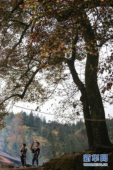 1月13日,在廣西融水苗族自治縣桿洞鄉(xiāng)烏英屯,小朋友在練習吹蘆笙。新華社記者 陳君清 攝
