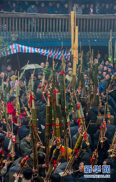 1月14日,人們在廣西融水苗族自治縣紅水鄉(xiāng)舉行的蘆笙節(jié)上賽蘆笙。新華社記者 陳君清 攝